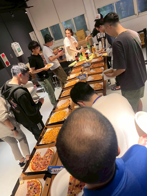 第二天晚上,主辦單位請大家吃 Pizza,整個場面很像黑客松,大家邊吃邊聊靈感。
