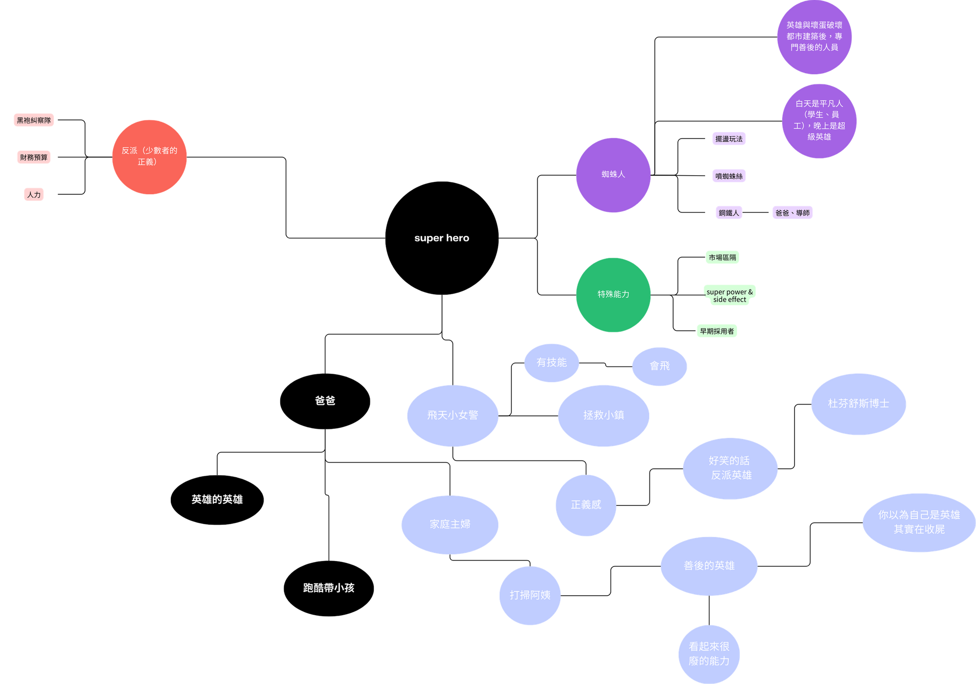 我們立刻打開 Canvas 當白板,展開創意腦力激盪。從搞笑英雄、日常英雄、潛入行動到面試設定,全部都丟上去。