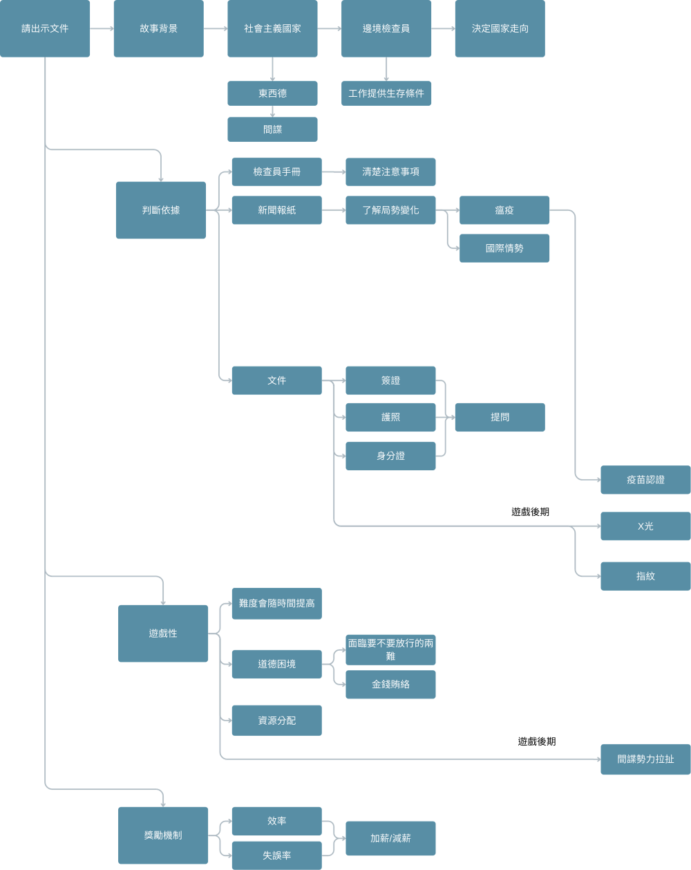 為了設計更完善的邏輯與流程,我們參考《請出示證件》的遊戲設計,並畫出以下分析圖: