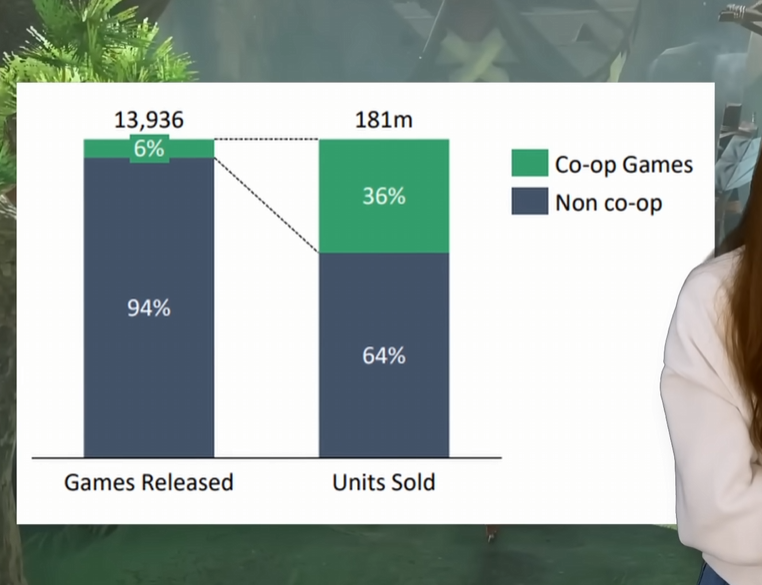 根據 VGI (遊戲數據分析公司)的統計數據顯示,2023 年 Steam 上發行的遊戲中,只有 6% 是合作遊戲,但它們卻佔據了總銷量的 36%。這顯示出這類遊戲在市場上受歡迎的程度極不合理地高。