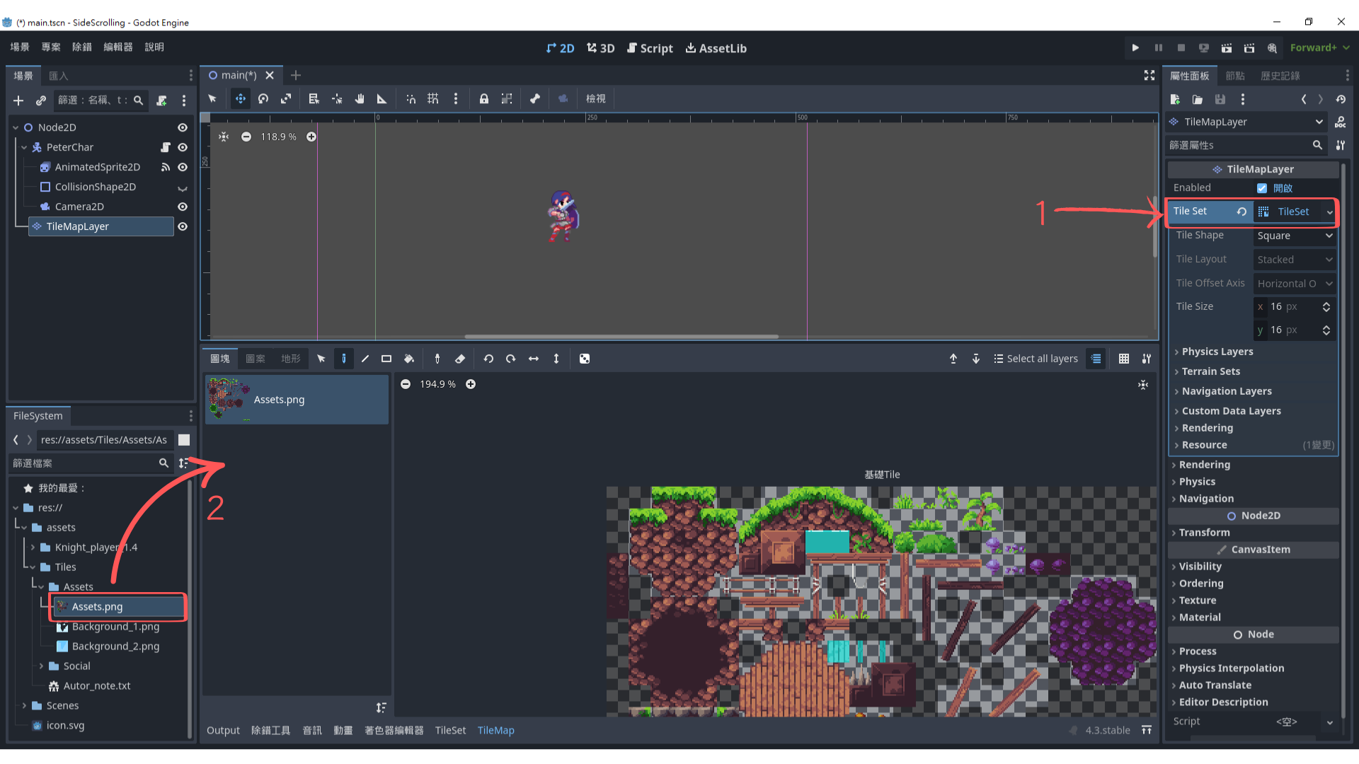 Godot 的地圖系統透過 TileMap 和 TileSet 來建立,跟著以下步驟完成設定吧!