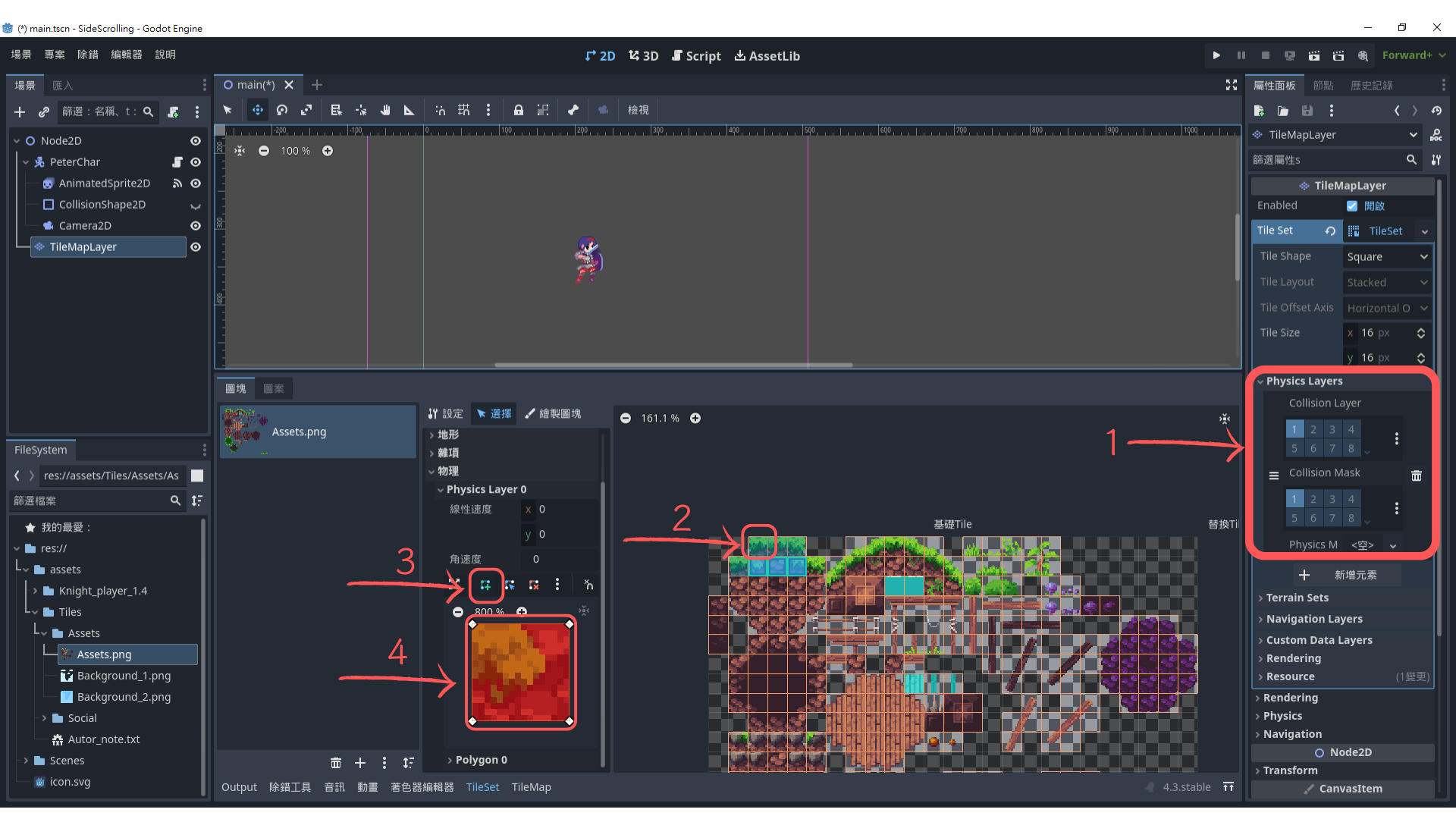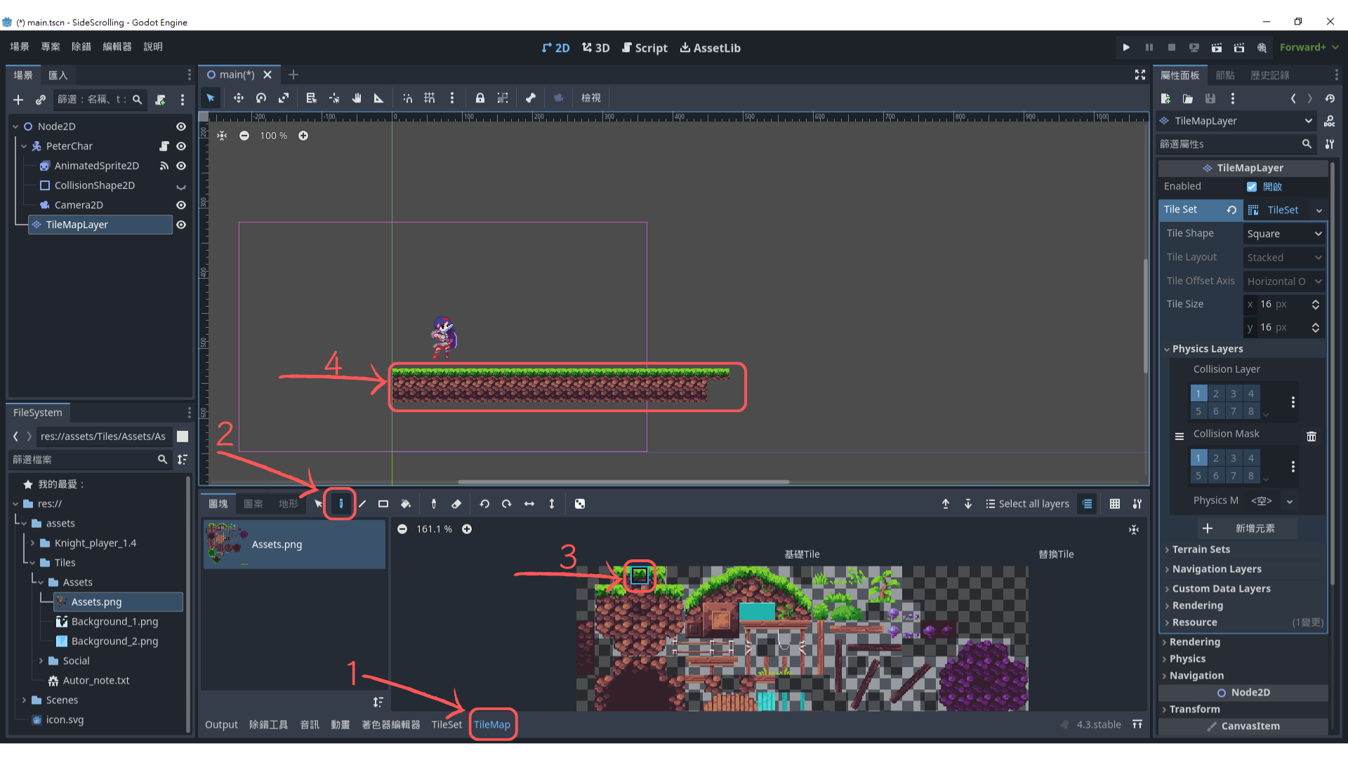 記得選取 TileMapLayer 節點。建議先畫一條地板讓角色站立,確認碰撞設定正確。