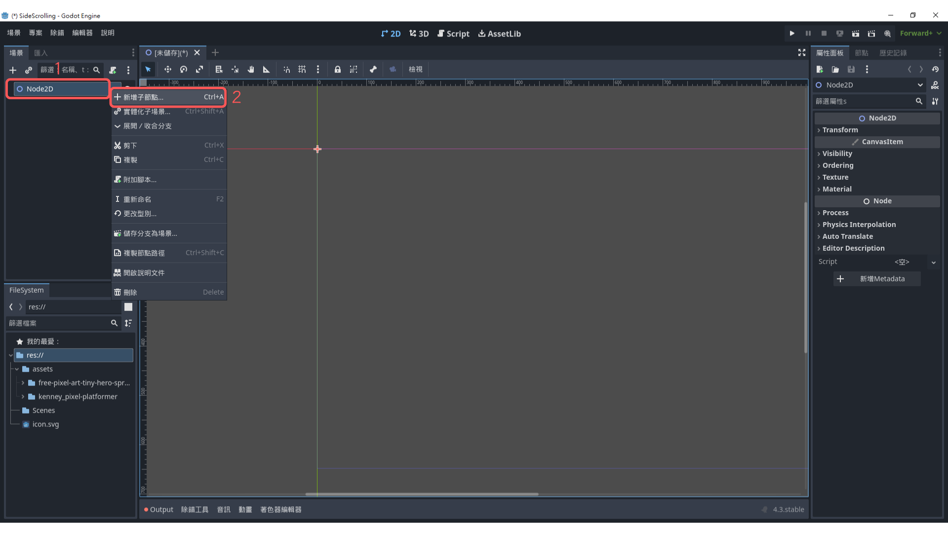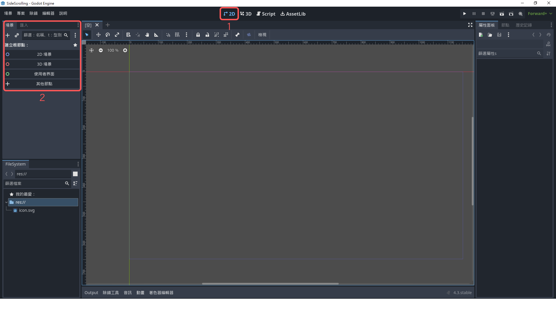 🎯 提醒:這次我們做的是 2D 遊戲,進入後記得切到「2D」視圖再新增「2D 場景」。
