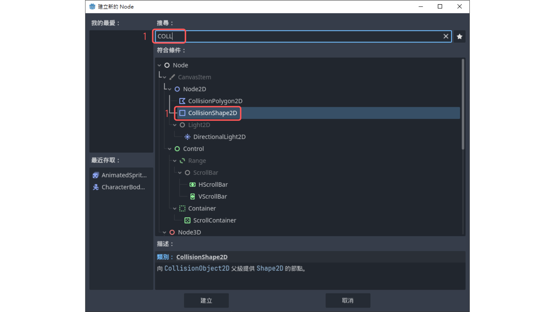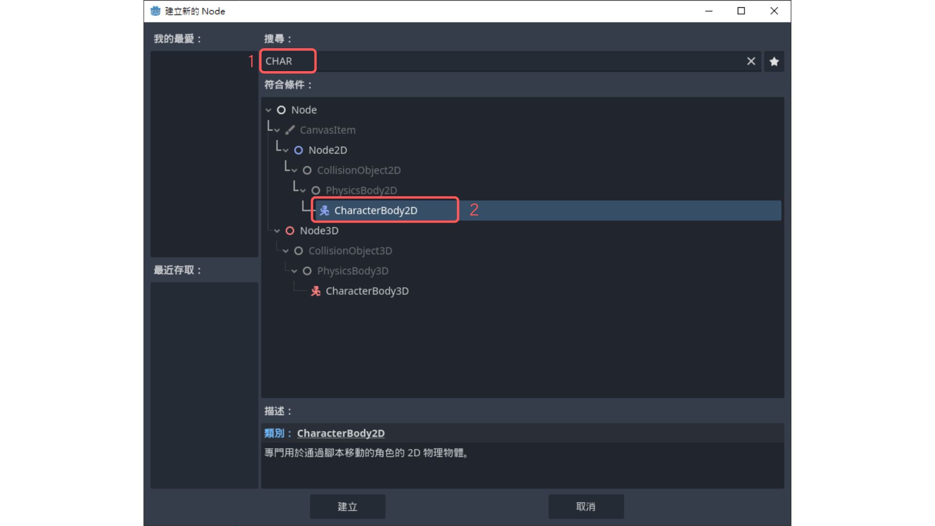 右鍵 Node2D > 新增子節點 > 搜尋 CharacterBody2D > 建立!