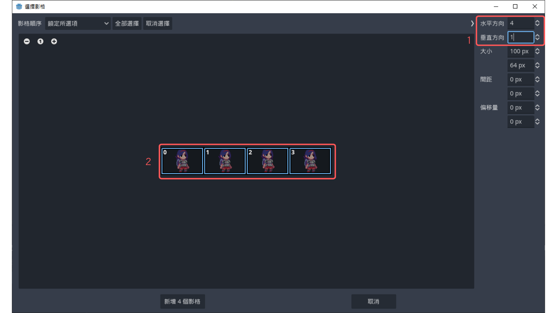 - 根據圖片的排版,設定「水平為 4」、「垂直為 1」來分割影格。