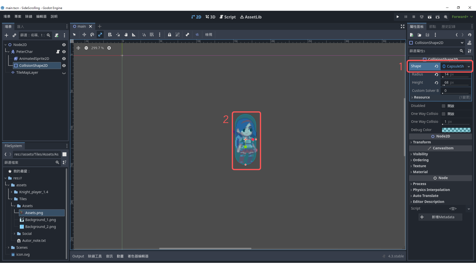 CapsuleShape2D(適合角色形狀) - 調整大小讓它包覆住角色,讓角色不會穿牆或卡住!